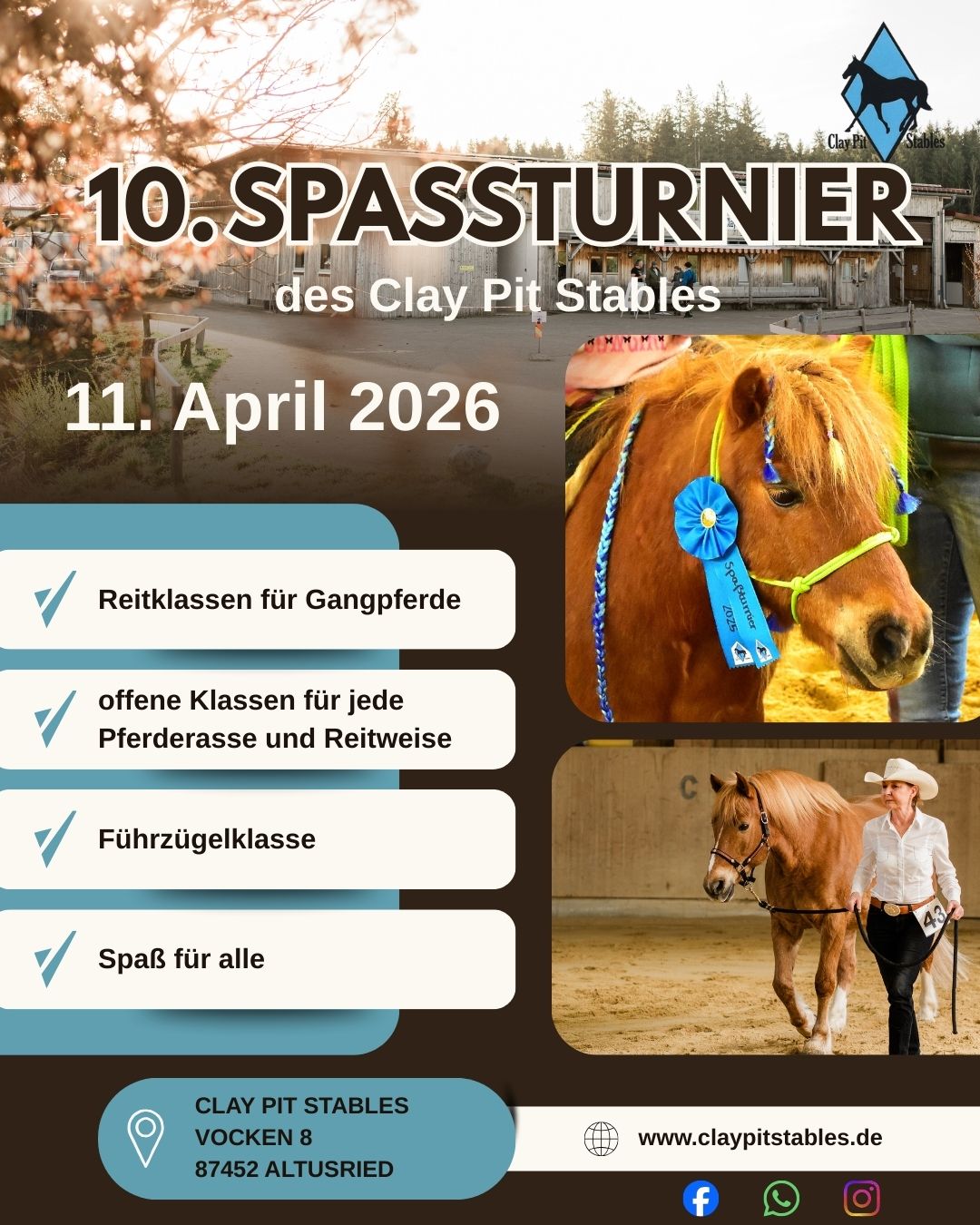 Das Clay Pit Stables Team lädt alle (Freizeit-) Reiter recht herzlich zum 10. Spaßturnier 2026 am Samstag, 11. April 2026 ein.